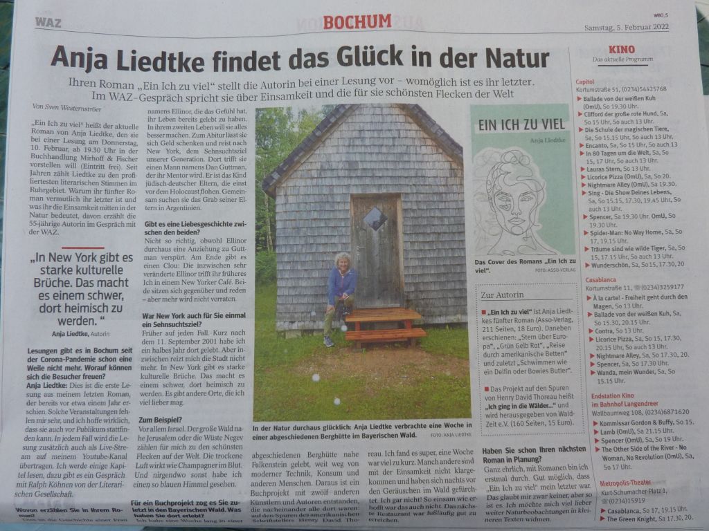 „Warum ihr fünfter Roman vermutlich ihr letzter ist und was ihr die Einsamkeit mitten in der Natur bedeutet, davon erzählt die 55-jährige Autorin im Gespräch mit der WAZ.“