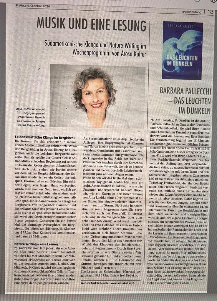 „Den Sommer über habe ich auf Wasseramseln in der Plessur geachtet. Erst jetzt entdecke ich ein Paar vor dem Einlauf in den Stausee. Weiße Brüste wie Quarz, graue Leiber und Flügel wie Schiefer und Serpentin, perfekt getarnt am Ufergestein. Die rundlichen Kiesel tauchen, schwimmen, fliegen, nah verwandt sind Fische und Vögel.“